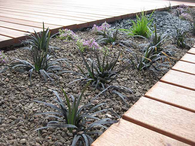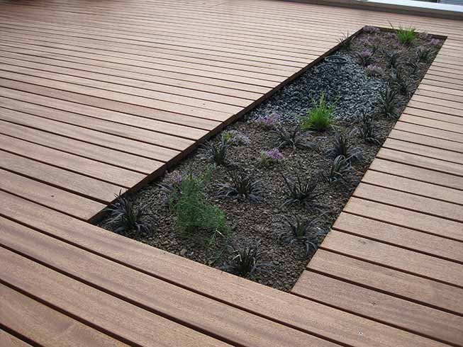 Die bepflanzte Aussparung im Holzdeck lockert optisch auf und soll später einem beleuchteten Felsen oder Buddha Platz bieten. Das Besondere: alles ist automatisch bewässert, sämtliche Leitungen wurden unsichtbar verlegt.