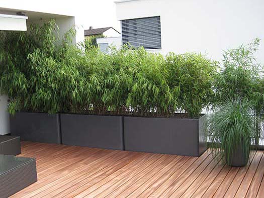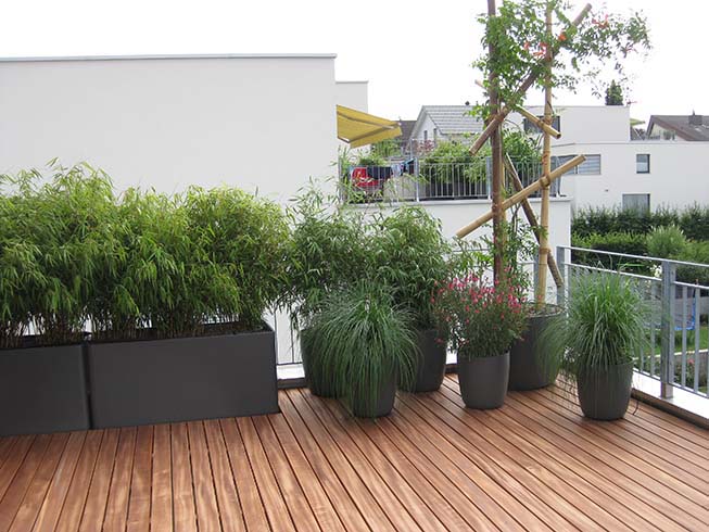 Ein Holzdeck wurde über den bestehenden Zementplattenboden verlegt. Schlicht-elegante bepflanzte Eternitgefässe geben der Terrasse ihren Charakter. In einem grossen Einzelgefäss setzten wir eine Trompetenwinde, die sich an einem einfachen Bambusgerüst emporrankt.